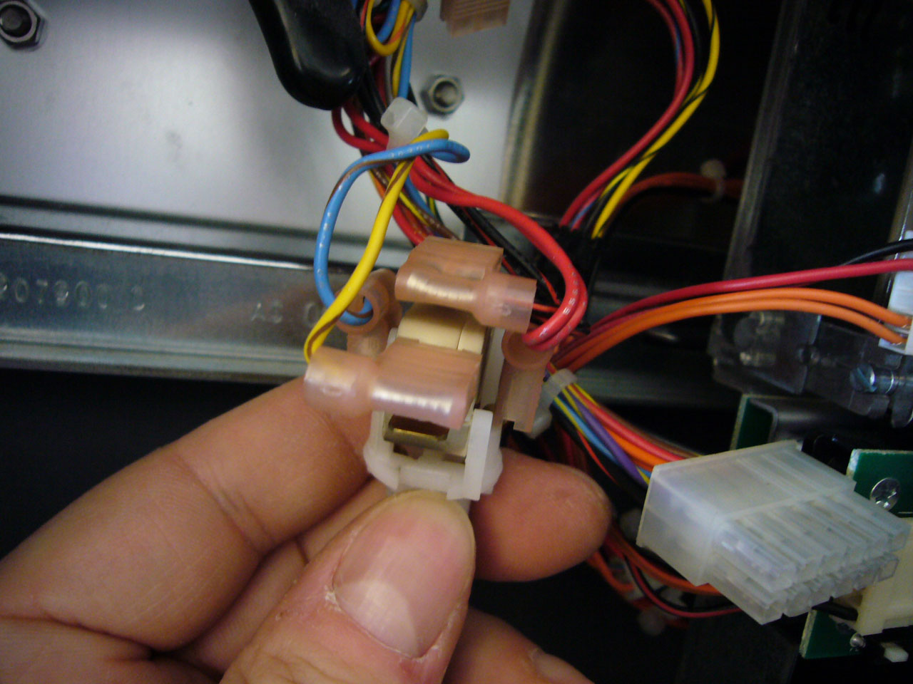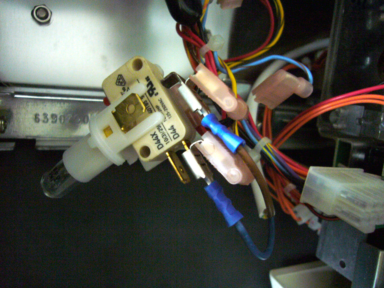 Les cosses gauche et droite (bleu et rouge) sont pour l’ampoule, celle du dessus et la jaune en face pour le contact de lancement des rouleaux.