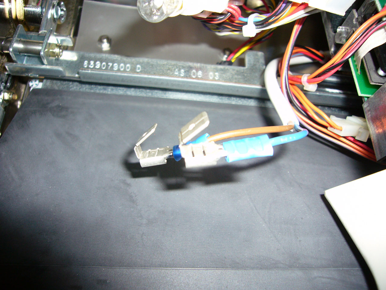 En retournant le bloc, on s’aperçoit qu’il y a 4 cosses. Logique, 2 pour l’alimentation de l’ampoule, 2 pour le contact qui lance les rouleaux. Pour savoir quelles cosses correspond à quoi, un simple coup d’œil, et un coup de multimètre pour confirmer…