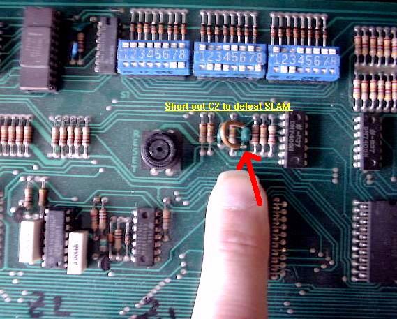 Comme les contacts de slam passent par les nappes de fils et par les connecteurs , la meilleure solution consiste à désactiver complètement les contacts de slam. Ceci peut etre fait sur la CPU : connectez à la masse la jonction de R12 et C2 ( ou plus simplement court-circuitez les deux pattes de C2)